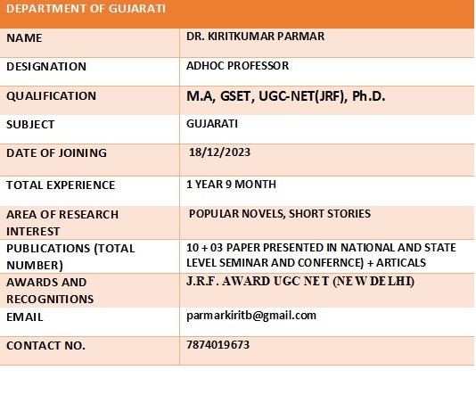 This institution observed in annals of history as one & only who offered Gujarati subject in PG level in whole district of Kheda and Anand district. Mr. Bharat Bambhaniya& Mr. Manish Vankar holding position as an educator in PG level.